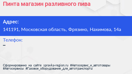 Пинта, магазин разливного пива по адресу 141191, Московская область, Фрязино, Нахимова, 14а в дальнейшем Организация, размещена в следующих категориях: