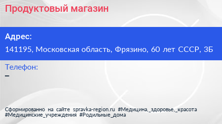 Продуктовый магазин по адресу 141195, Московская область, Фрязино, 60 лет СССР, 3Б в дальнейшем Организация, размещена в следующих категориях: