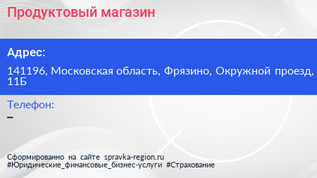 Продуктовый магазин по адресу 141196, Московская область, Фрязино, Окружной проезд, 11Б в дальнейшем Организация, размещена в следующих категориях:
