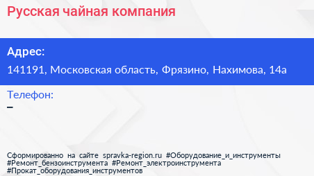 Русская чайная компания по адресу 141191, Московская область, Фрязино, Нахимова, 14а в дальнейшем Организация, размещена в следующих категориях: