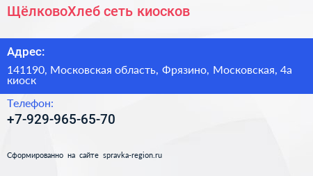ЩёлковоХлеб, сеть киосков по адресу 141190, Московская область, Фрязино, Московская, 4а киоск в дальнейшем Организация, размещена в следующих категориях: