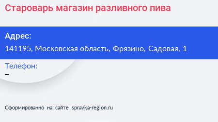 Староварь, магазин разливного пива по адресу 141195, Московская область, Фрязино, Садовая, 1 в дальнейшем Организация, размещена в следующих категориях: