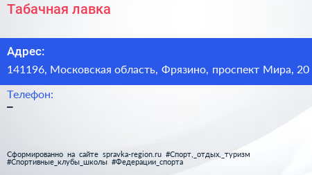 Табачная лавка по адресу 141196, Московская область, Фрязино, проспект Мира, 20 в дальнейшем Организация, размещена в следующих категориях: