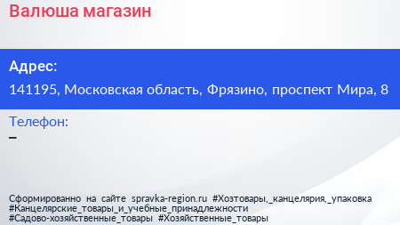 Валюша, магазин по адресу 141195, Московская область, Фрязино, проспект Мира, 8 в дальнейшем Организация, размещена в следующих категориях: