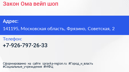 Закон Ома, вейп-шоп по адресу 141195, Московская область, Фрязино, Советская, 2 в дальнейшем Организация, размещена в следующих категориях: