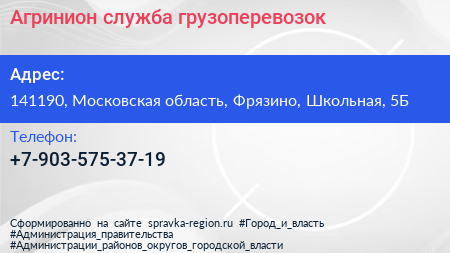 Агринион, служба грузоперевозок по адресу 141190, Московская область, Фрязино, Школьная, 5Б в дальнейшем Организация, размещена в следующих категориях: