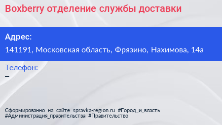Boxberry, отделение службы доставки по адресу 141191, Московская область, Фрязино, Нахимова, 14а в дальнейшем Организация, размещена в следующих категориях: