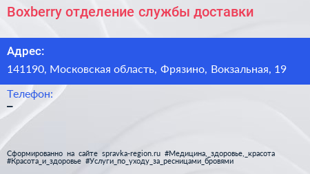 Boxberry, отделение службы доставки по адресу 141190, Московская область, Фрязино, Вокзальная, 19 в дальнейшем Организация, размещена в следующих категориях: