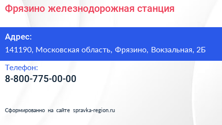 Фрязино, железнодорожная станция по адресу 141190, Московская область, Фрязино, Вокзальная, 2Б в дальнейшем Организация, размещена в следующих категориях: