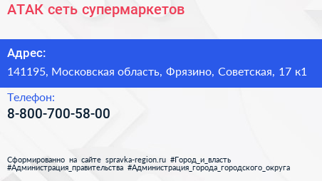 АТАК, сеть супермаркетов по адресу 141195, Московская область, Фрязино, Советская, 17 к1 в дальнейшем Организация, размещена в следующих категориях:
