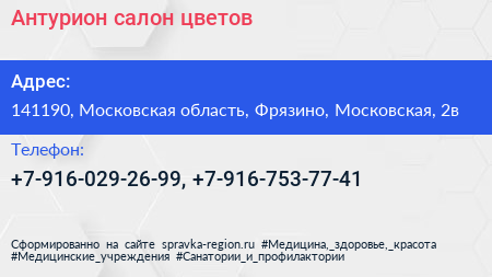 Антурион, салон цветов по адресу 141190, Московская область, Фрязино, Московская, 2в в дальнейшем Организация, размещена в следующих категориях: