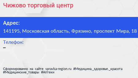 Чижово, торговый центр по адресу 141195, Московская область, Фрязино, проспект Мира, 18 в дальнейшем Организация, размещена в следующих категориях: