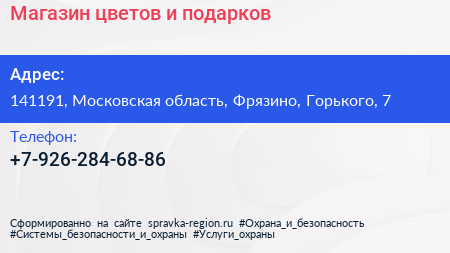 Магазин цветов и подарков по адресу 141191, Московская область, Фрязино, Горького, 7 в дальнейшем Организация, размещена в следующих категориях: