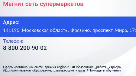 Магнит, сеть супермаркетов по адресу 141196, Московская область, Фрязино, проспект Мира, 17а в дальнейшем Организация, размещена в следующих категориях: