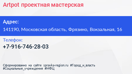Artpot, проектная мастерская по адресу 141190, Московская область, Фрязино, Вокзальная, 16 в дальнейшем Организация, размещена в следующих категориях: