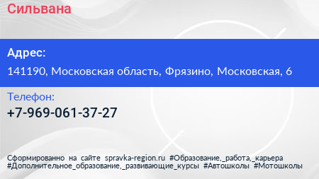 Сильвана по адресу 141190, Московская область, Фрязино, Московская, 6 в дальнейшем Организация, размещена в следующих категориях: