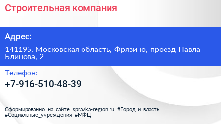 Строительная компания по адресу 141195, Московская область, Фрязино, проезд Павла Блинова, 2 в дальнейшем Организация, размещена в следующих категориях: