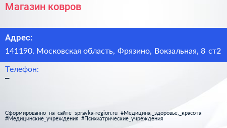 Магазин ковров по адресу 141190, Московская область, Фрязино, Вокзальная, 8 ст2 в дальнейшем Организация, размещена в следующих категориях: