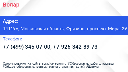Волар по адресу 141196, Московская область, Фрязино, проспект Мира, 29 в дальнейшем Организация, размещена в следующих категориях: