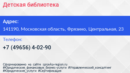 Детская библиотека по адресу 141190, Московская область, Фрязино, Центральная, 23 в дальнейшем Организация, размещена в следующих категориях: