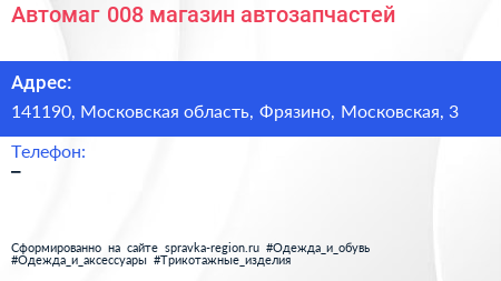 Автомаг 008, магазин автозапчастей по адресу 141190, Московская область, Фрязино, Московская, 3 в дальнейшем Организация, размещена в следующих категориях: