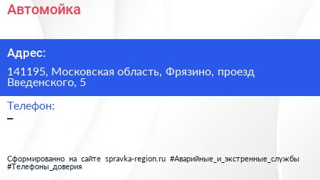 Автомойка по адресу 141195, Московская область, Фрязино, проезд Введенского, 5 в дальнейшем Организация, размещена в следующих категориях: