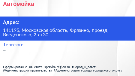 Автомойка по адресу 141195, Московская область, Фрязино, проезд Введенского, 2 ст30 в дальнейшем Организация, размещена в следующих категориях: