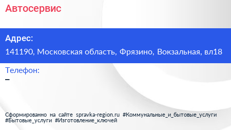 Автосервис по адресу 141190, Московская область, Фрязино, Вокзальная, вл18 в дальнейшем Организация, размещена в следующих категориях: