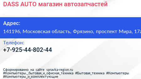 DASS AUTO, магазин автозапчастей по адресу 141196, Московская область, Фрязино, проспект Мира, 17а в дальнейшем Организация, размещена в следующих категориях: