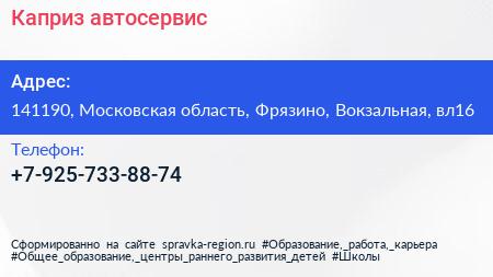 Каприз, автосервис по адресу 141190, Московская область, Фрязино, Вокзальная, вл16 в дальнейшем Организация, размещена в следующих категориях: