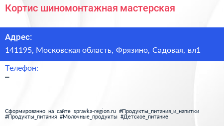 Кортис, шиномонтажная мастерская по адресу 141195, Московская область, Фрязино, Садовая, вл1 в дальнейшем Организация, размещена в следующих категориях: