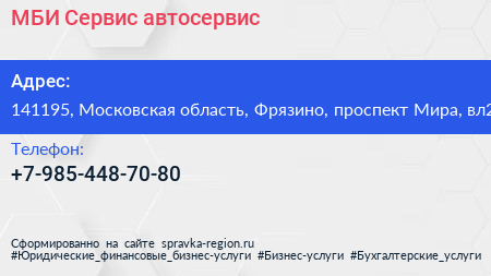 МБИ-Сервис, автосервис по адресу 141195, Московская область, Фрязино, проспект Мира, вл2 в дальнейшем Организация, размещена в следующих категориях: