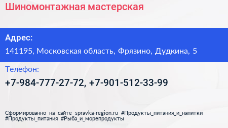 Шиномонтажная мастерская по адресу 141195, Московская область, Фрязино, Дудкина, 5 в дальнейшем Организация, размещена в следующих категориях: