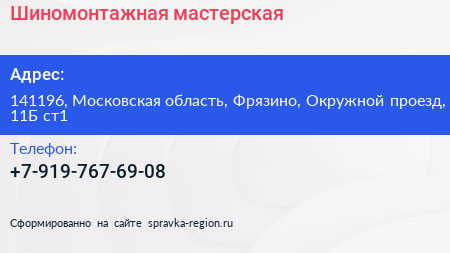 Шиномонтажная мастерская по адресу 141196, Московская область, Фрязино, Окружной проезд, 11Б ст1 в дальнейшем Организация, размещена в следующих категориях:
