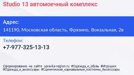 Studio 13, автомоечный комплекс по адресу 141190, Московская область, Фрязино, Вокзальная, 2в в дальнейшем Организация, размещена в следующих категориях: