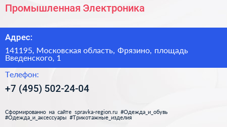 Промышленная Электроника по адресу 141195, Московская область, Фрязино, площадь Введенского, 1 в дальнейшем Организация, размещена в следующих категориях: