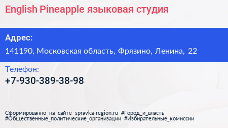 English Pineapple, языковая студия по адресу 141190, Московская область, Фрязино, Ленина, 22 в дальнейшем Организация, размещена в следующих категориях: