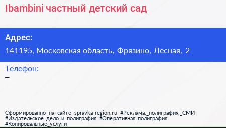 Ibambini, частный детский сад по адресу 141195, Московская область, Фрязино, Лесная, 2 в дальнейшем Организация, размещена в следующих категориях: