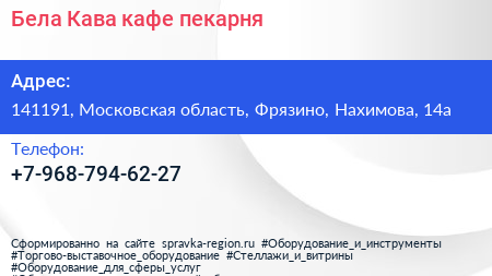 Бела Кава, кафе-пекарня по адресу 141191, Московская область, Фрязино, Нахимова, 14а в дальнейшем Организация, размещена в следующих категориях: