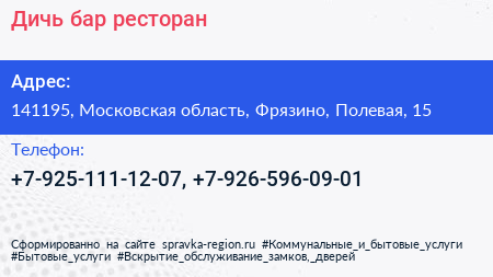 Дичь, бар-ресторан по адресу 141195, Московская область, Фрязино, Полевая, 15 в дальнейшем Организация, размещена в следующих категориях: