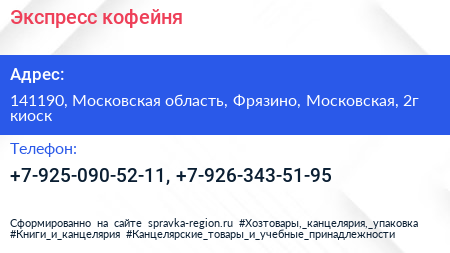 Экспресс-кофейня по адресу 141190, Московская область, Фрязино, Московская, 2г киоск в дальнейшем Организация, размещена в следующих категориях: