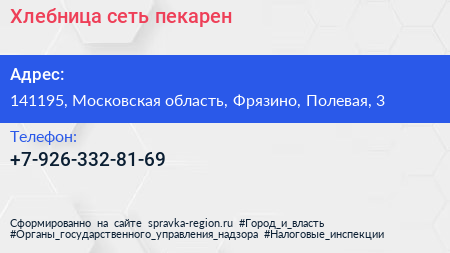 Хлебница, сеть пекарен по адресу 141195, Московская область, Фрязино, Полевая, 3 в дальнейшем Организация, размещена в следующих категориях: