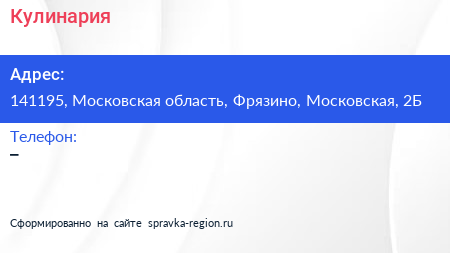 Кулинария по адресу 141195, Московская область, Фрязино, Московская, 2Б в дальнейшем Организация, размещена в следующих категориях: