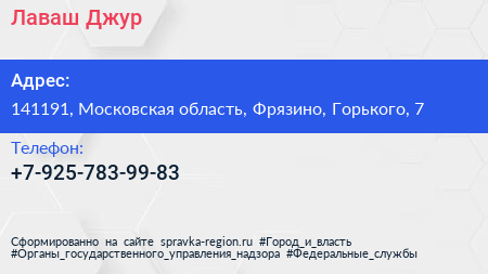 Лаваш & Джур по адресу 141191, Московская область, Фрязино, Горького, 7 в дальнейшем Организация, размещена в следующих категориях: