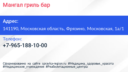 Мангал, гриль-бар по адресу 141190, Московская область, Фрязино, Московская, 1а/1 в дальнейшем Организация, размещена в следующих категориях: