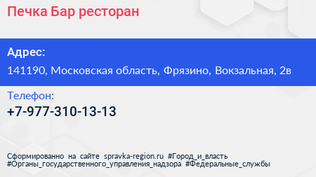 Печка Бар, ресторан по адресу 141190, Московская область, Фрязино, Вокзальная, 2в в дальнейшем Организация, размещена в следующих категориях: