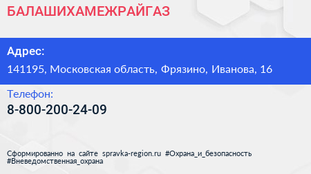 БАЛАШИХАМЕЖРАЙГАЗ по адресу 141195, Московская область, Фрязино, Иванова, 16 в дальнейшем Организация, размещена в следующих категориях: