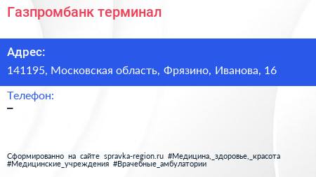 Газпромбанк, терминал по адресу 141195, Московская область, Фрязино, Иванова, 16 в дальнейшем Организация, размещена в следующих категориях: