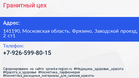 Гранитный цех по адресу 141190, Московская область, Фрязино, Заводской проезд, 2 ст1 в дальнейшем Организация, размещена в следующих категориях: