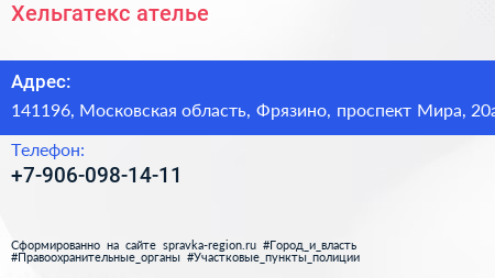 Хельгатекс, ателье по адресу 141196, Московская область, Фрязино, проспект Мира, 20а в дальнейшем Организация, размещена в следующих категориях: